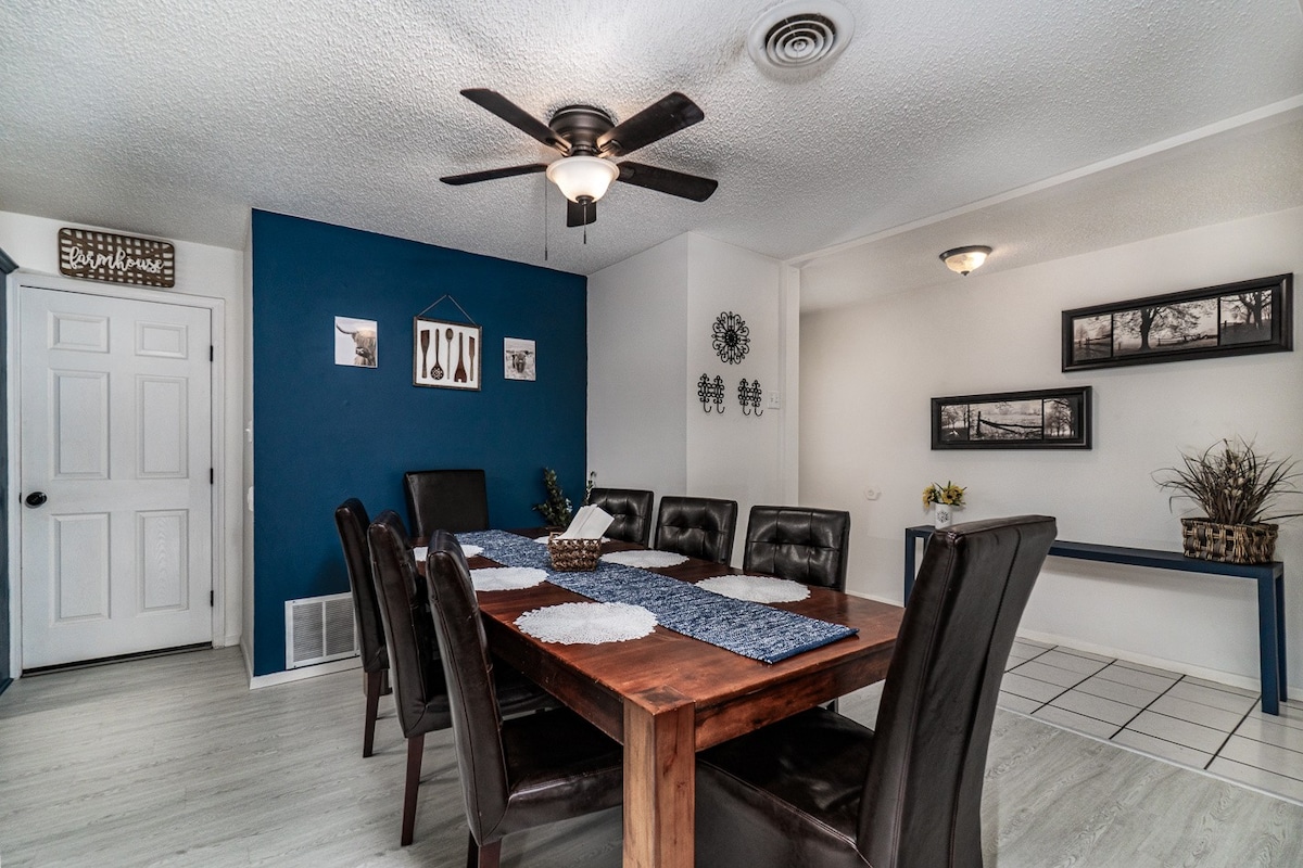 Shtëpi shumë e veçantë në Borger TX! Shtëpi me 4 dhoma gjumi dhe 3 banja, e projektuar për ekipe pune dhe pushime familjare. Shijo një dhomë private teatri, një karrige masazhi, divane të shumëfishtë, televizorë në çdo dhomë dhe një kuzhinë të plotë me ngrënie për tetë persona. Garazhi ofron një hapësirë të rastësishme për t 'u çlodhur pas një dite të gjatë me lojëra nga të cilat mund të zgjedhësh. E vendosur pranë restoranteve dhe një parku të madh të përshtatshëm për familje dhe kafshë shtëpiake, si dhe 21 minuta larg liqenit, banesa ofron privatësi me qasje të lehtë brenda dhe jashtë qytetit. Jemi të lumtur të të urojmë mirëseardhjen!