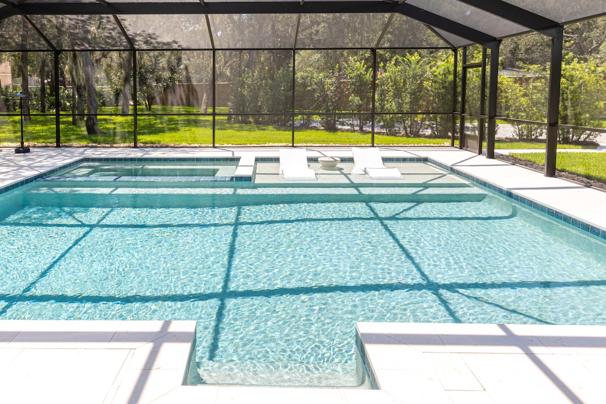 Përjeto sharmin e Floridës së Vjetër në këtë banesë mahnitëse me 3 dhoma gjumi dhe 3 banja. E përkryer për familje ose grupe, ajo krenohet me një krevat marinari dopio "queen over-queen" për rehati shtesë. Shijo çlodhjen pranë pishinës së re, spa-së dhe verandës për rrezitje të rrethuara nga pemë madhështore lisi të mbuluara me myshk spanjoll. Kuzhina e jashtme e sapondërtuar është ideale për argëtim, e kompletuar me një skarë, frigorifer dhe oxhak të rehatshëm. Ky pushim unik ofron një përzierje të shërbimeve moderne dhe bukurisë së përjetshme.