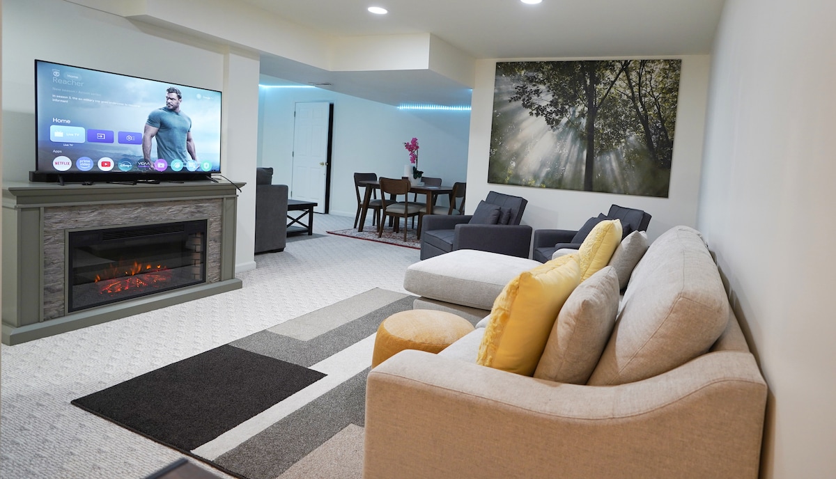 Welcome to Your Private Garden Retreat in Herndon! Enjoy a peaceful getaway in this beautifully designed 2-bedroom basement unit, each bedroom featuring an en-suite bathroom and a dedicated workspace—perfect for comfort and productivity. Relax in the spacious living area with a 6-seater sectional, a 65-in smart TV, an open-concept kitchen fully stocked with all the essentials. The master bedroom also includes its own 55-in TV. Come unwind in this cozy oasis—your perfect escape awaits!
