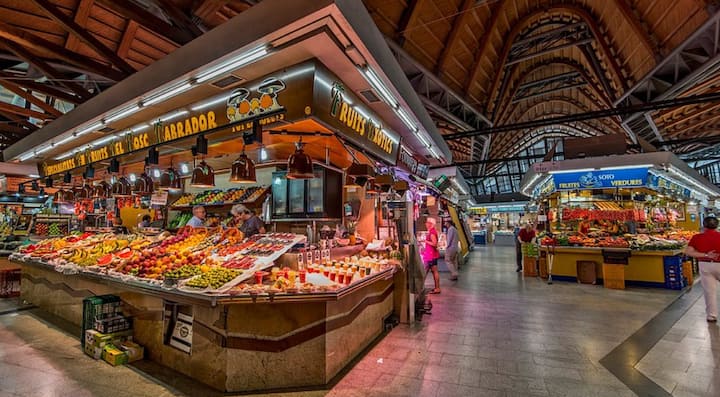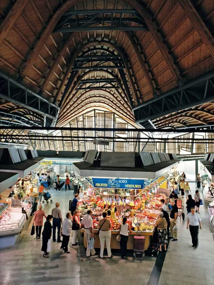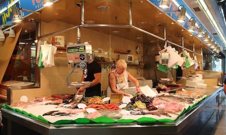 Shijo tregimet dhe mallrat në tezgat katalanase të djathit, mishit të tharë, ullinjve dhe frutave të detit.