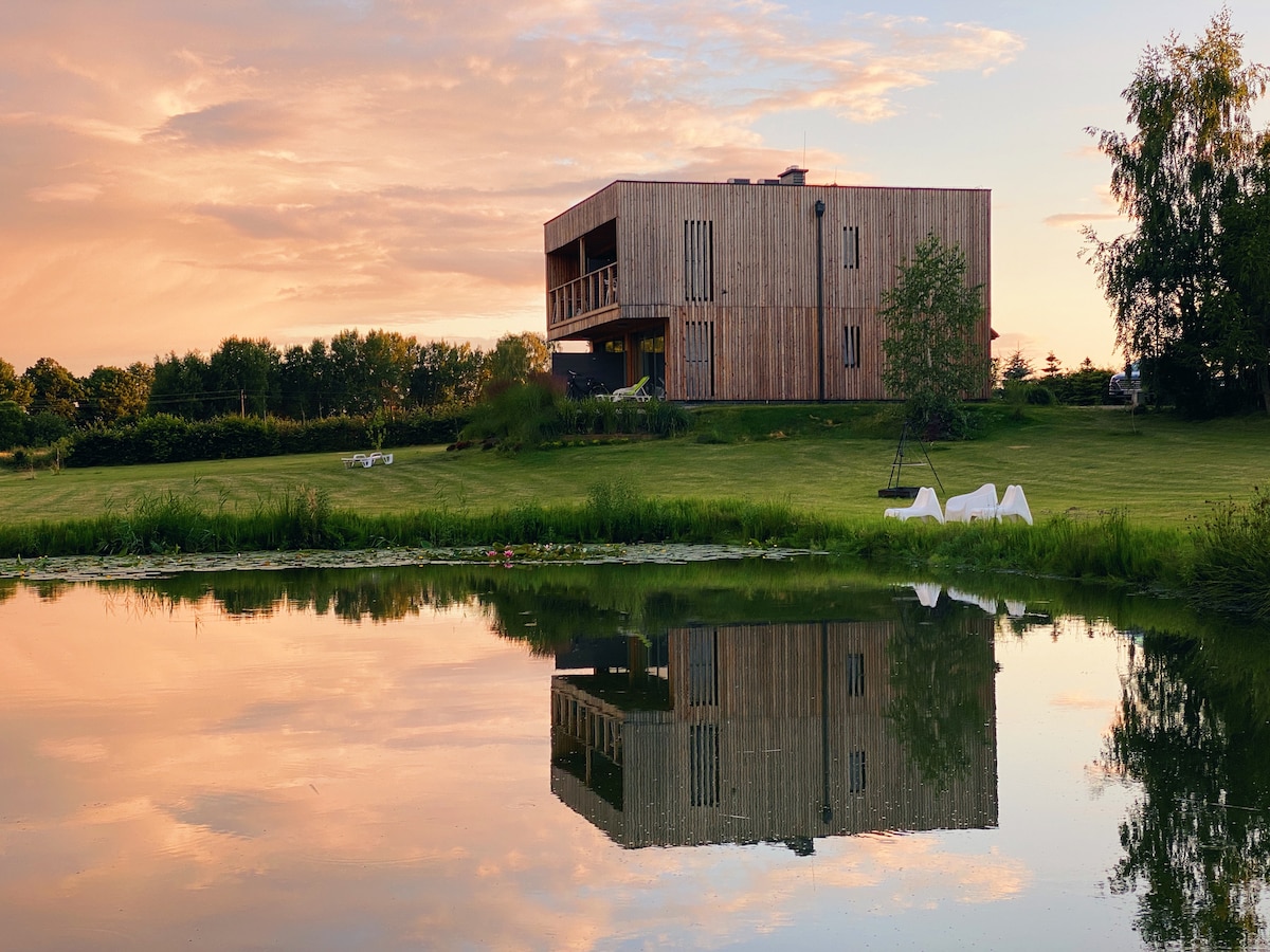 Masuria është një rajon i bukur i Polonisë ku liqenet natyrore na rrethojnë nga të gjitha anët. Për ne, kontakti me natyrën masuriane të kudondodhur është veçanërisht i rëndësishëm. Kjo është arsyeja pse vetëm gjashtë shtëpi ndodhen në një zonë të madhe në distanca të rehatshme për vizitorët. Xhami në dhomën e ndenjjes dhe tarraca e gjerë ofrojnë pamje unike pavarësisht kohës së ditës ose vitit (shtëpitë kanë oxhak dhe ngrohje qendrore). Zona e përbashkët përbëhet nga zona të gjera lëndine dhe një kopsht me perime.