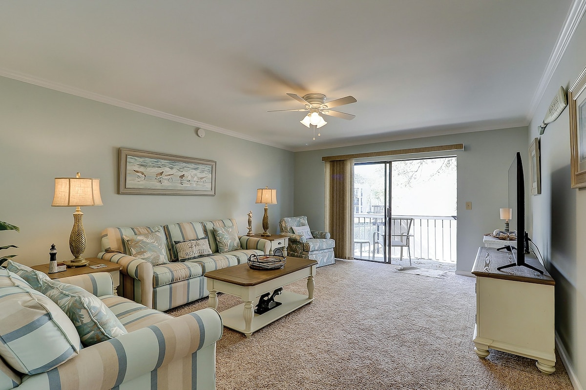 Gated Beach & Golf Resort! ✨ Top 10% Airbnb Guest Favorite ✨ Beach, Golf, Pool, Spa, Restaurants & Bars FREE Pickleball & Tennis – across the street HGTV Decorator designed Panoramic Golf & Lagoon Views! Big Porch Huge Old Oak trees! Coastal Décor Sunny 1st Floor End Unit KING BED + 2 QUEENS 3 XL SmartTVs FREE: FAST WIFI & CABLE Marble Kitchen Washer/Dryer Beach Cart, Chairs, Boogie Boards, Ice Chest BBQ Walk & Bike Path to Beach! Walk to Golf Club & Pub Close to Coligny Summer Beach Shuttle