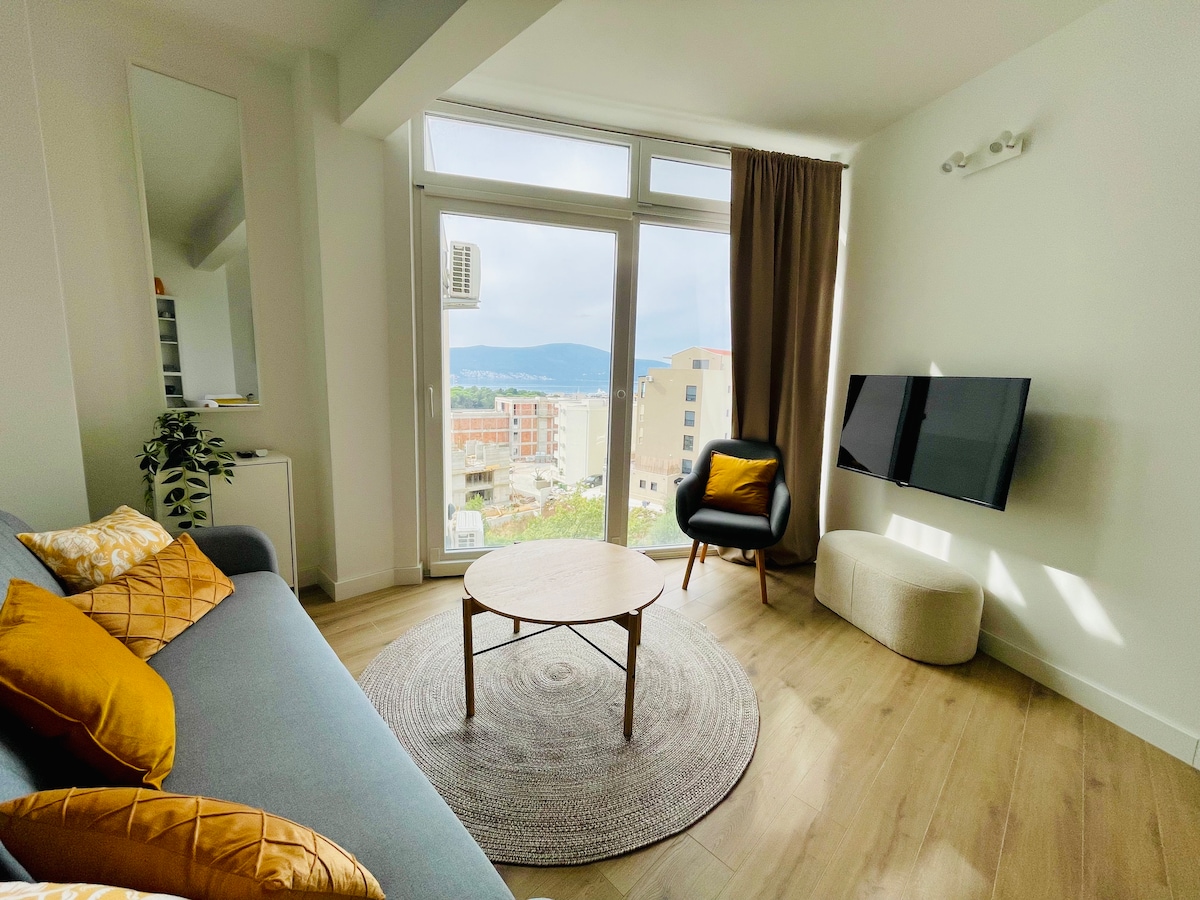 Apartament i ri në Tivat, rezidencë e re, me pamje nga deti Pishinë panoramike Hyrje falas në SPA, xhakuzi, sauna, zonë çlodhjeje Hyrje private në banesë me tarraca të mëdha, pishinë me pamje nga deti, pamje nga marina në Porto Montenegro. 800 metra nga Porto Mali i Zi dhe deti Kuzhinë e pajisur plotësisht, dhomë gjumi me madhësi dopio "queen", dhomë ndenjjeje me divan krevat, dollap me hapësirë të bollshme, dush në këmbë, ajër të kondicionuar Parkim falas 4 km aeroport *Peshqir, shtroja, pastrimi i përfshirë * Hapja e pishinës në varësi të motit dhe mirëmbajtjes