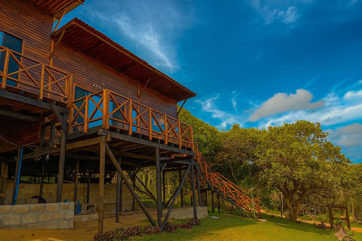 Vetëm një orë larg me varkë nga Maputo, kjo shtëpi e thjeshtë plazhi me pamje spektakolare nga deti është e mbushur me natyrë. Pranë Rezervës së Elefantit, delfinët, flamingot, majmunët dhe duikerët e kuq janë vizitorë të zakonshëm. Shijo plazhin e qetë të pacenuar dhe zhytu në rezervatin e mahnitshëm natyror. 5min ecje përpjetë nga plazhi në kabinë. Dhe mos pritshmëri të larta për shkak të recensioneve të mrekullueshme:) Është thjesht një kabinë e thjeshtë druri.