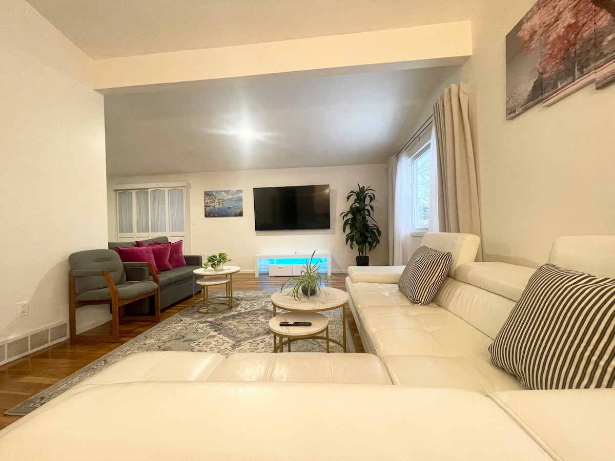 Kjo shtëpi e qetë me tre dhoma gjumi me 1.5 banja ka një kuzhinë të kompletuar. Mund të shijosh mëngjesin në qoshe të kuzhinës dhe ushqime më të konsiderueshme në dhomën e ngrënies. Dy hapësira të veçanta ndenjjeje - një dhomë ndenjjeje dhe një dhomë e madhe familjare me Smart TV dhe zyre, si anëtarë të grupit për të ndjekur aktivitete të ndryshme. Dhoma kryesore e gjumit ka një banjë gjysmë të bashkangjitur për privatësi. Lagjja e qetë e banimit ka dy parqe dhe shtigje për ecje vetëm disa blloqe larg.