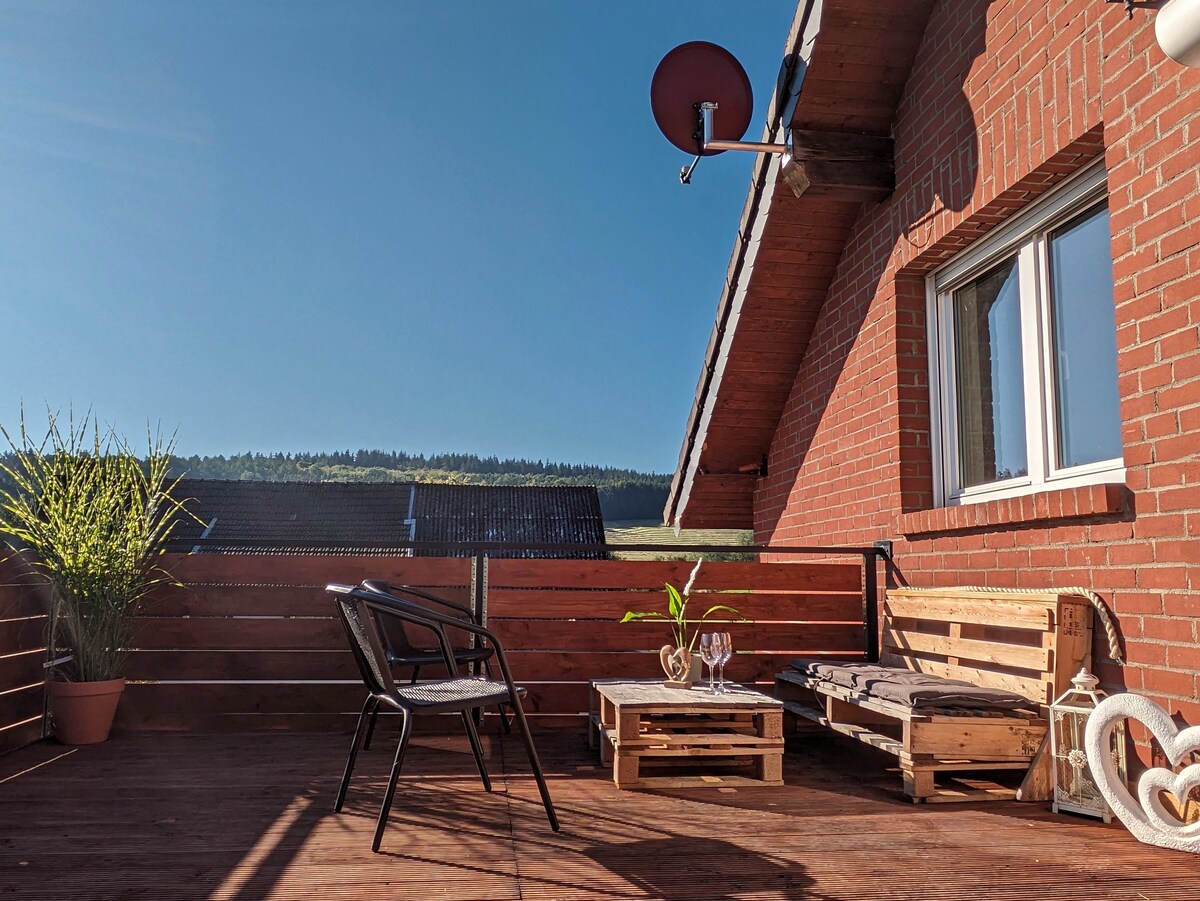 Në apartamentin 60 metra katrorë me hyrjen e vet do të gjesh gjithçka që të duhet për pushime. 1 krevat dopio + 1 divan krevat për maksimumi. 4 persona - parkim para shtëpisë Në pak minuta ju jeni tashmë në pyll në këmbë, në 588 metra të lartë Michelsberg dhe mund të ecni në të gjitha drejtimet. Me makinë, mund të arrish Nürburgring për gjysmë ore të mirë, në Ahr, Ruhrsee ose Phantasialand Brühl. Pazar 10 km larg. Qentë janë të mirëpritur pas konsultimit.