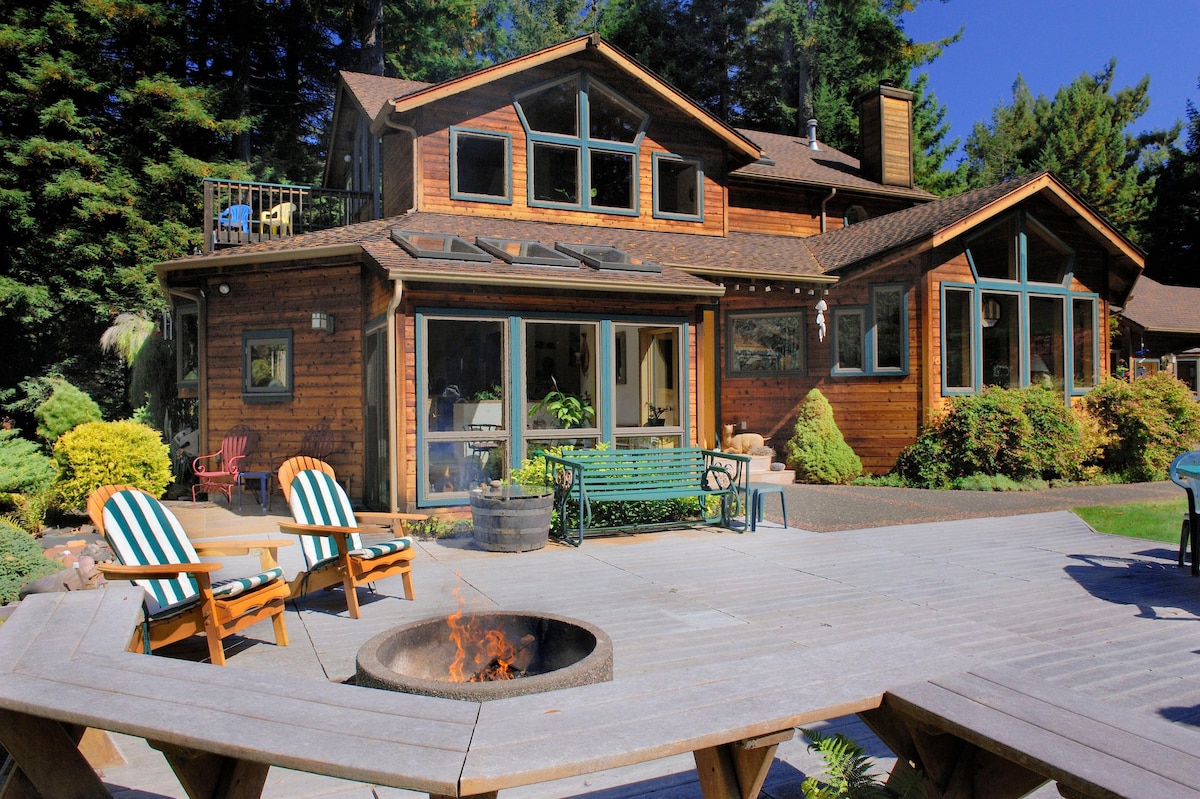 Mirë se erdhe në shtëpinë tënde modeste në bregdetin Humboldt. Zgjohu me kafe në verandë me pamje të hapur të Parkut Kombëtar Redwood dhe Redwood Creek. Më pas ec, udhëto ose shko me makinë pranë tufës së drerit deri te drunjtë e kuq të vjetër, ose ndiq përroin drejt Paqësorit të fuqishëm me milje plazh të sheshtë. Kalo më shumë kohë duke eksploruar me qasjen më të mirë në pyje të kuqe gjigande, plazhe që të lënë pa frymë dhe peshkim fenomenal. Kthehu në shtëpi për të luajtur cornhole, futboll tavoline, për të ngrënë ëmbëlsira smores, për të bërë një zjarr të madh dhe për të parë një film, si dhe për të bërë një banjë të nxehtë nën yje!