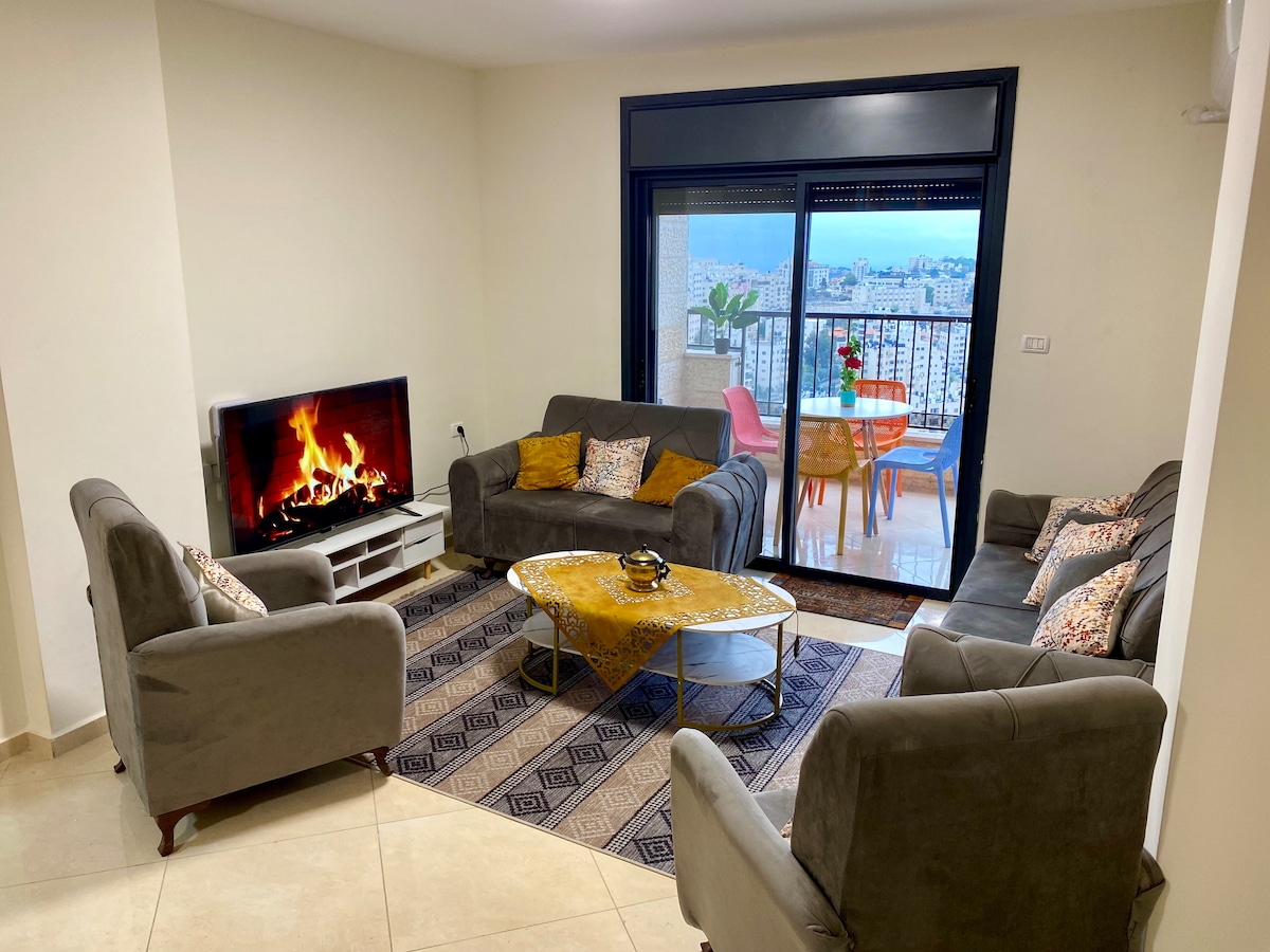 Apartamenti ynë me 2 dhoma gjumi i projektuar bukur ofron një vendndodhje qendrore në një lagje të qetë. Ideale për familjet, miqtë ose udhëtarët e biznesit, kjo hapësirë përfshin: - 2 dhoma gjumi me krevate të rehatshëm. - Ngrohje/ ftohje/ujë të nxehtë - Kuzhinë e pajisur plotësisht me enëlarëse. - 2 banja të plota - Wifi me shpejtësi të lartë ( fibra) Vendndodhja : - 5 minuta larg nga sheshi Ramallah Manarah. - 10 minuta më këmbë nga pista e bashkisë Ramallah dhe Muzeu Mahmoud Darwish.