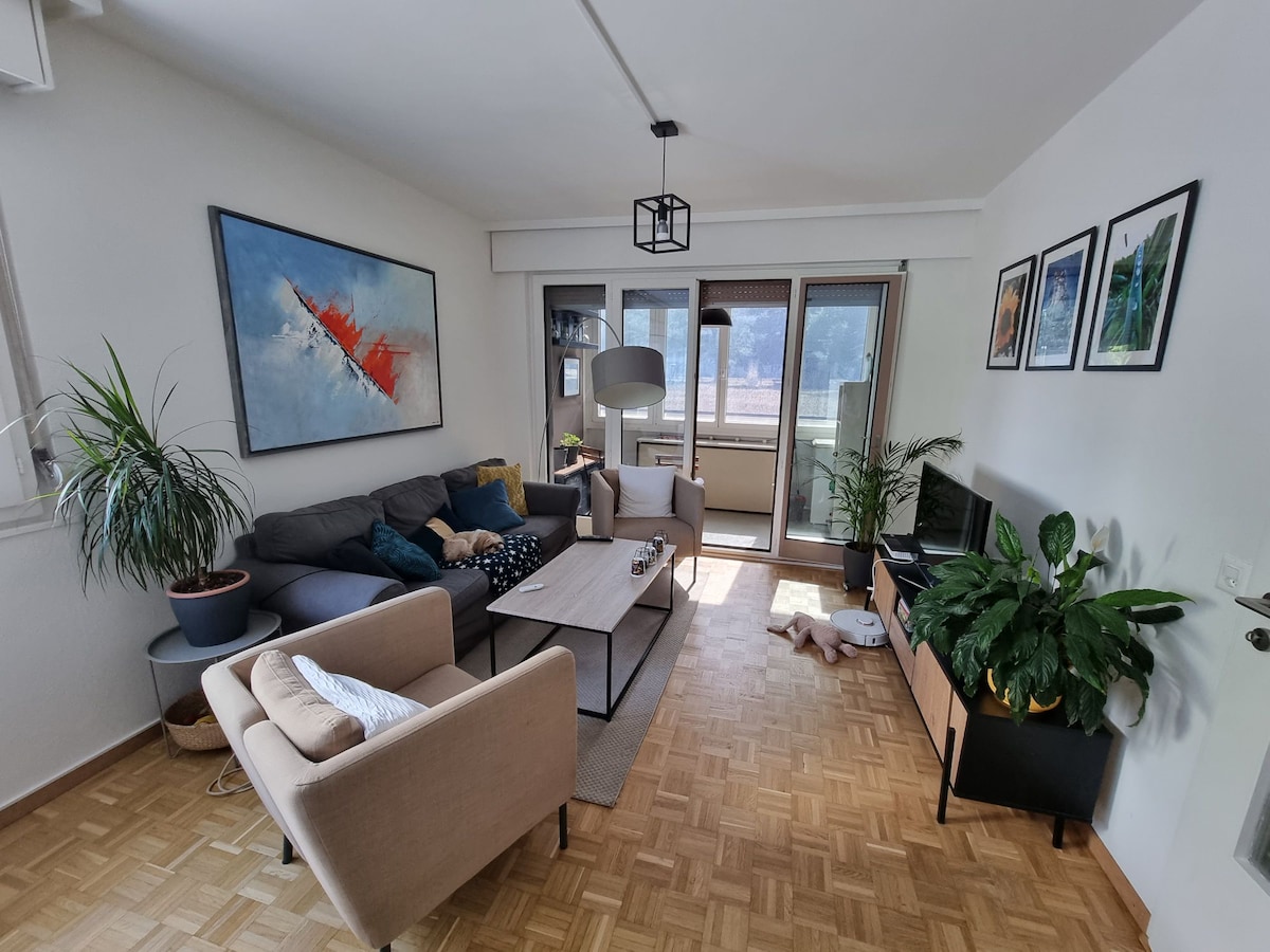 Ambienti im është shumë i këndshëm dhe një atmosferë e këndshme. Ajo ka 2 dhoma gjumi, një dhomë të madhe ndenjjeje, një banjo, banjo të veçanta, një kichen të vendosur bukur me një tavolinë të rrumbullakët dhe mbi të gjitha një ballkon shumë të bukur me një pamje përrallore në Gjenevë dhe malet përreth. Është 20 mns udhëtim me tramvaj për në stacion, 15 mns udhëtim me tramvaj nga qendra dhe 20 mbs udhëtim me autobus nga aeroporti. Ndodhet në katin e 7-të me një ashensor pune dhe vjen me akomodimet.