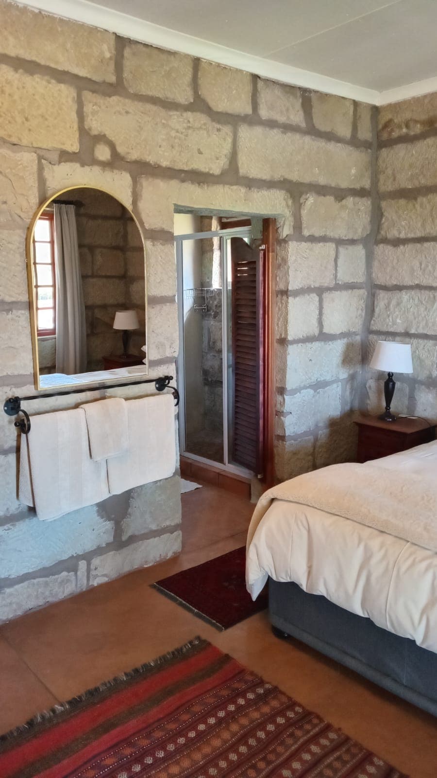 The Stables, is a basic and rustic self-catering cottage situated on Franshoek Farm, in the Witterberg Mountains, near Ficksburg. The cottage is located on the sandstone bluff, over-looking a magnificent view of the Valley. As farm stay guests, you enjoy a fully equipped self-catering kitchen which enjoins a central living space with a fireplace. There is a braai and central firepit. Please be advised that the 2 rooms are seperated and not conjoined in the 1 unit.