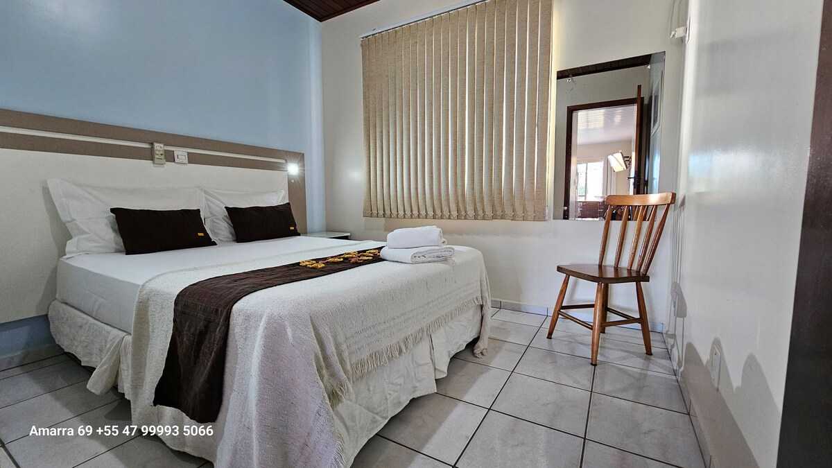 🌿 Pushim ideal për një çift në Bombinhas Apartament për një çift 500 m nga plazhi dhe qendra e Bombinhas. Dhomë komode me ajër të kondicionuar, dhomë ndenjjeje, kuzhinë të pajisur, Wi-Fi me fibra dhe hapësirë individuale parkimi. Skarë për përdorim të përbashkët. Shtrojat, peshqirët, kiti i plazhit dhe enët bazë janë të përfshira. E përkryer për t'u çlodhur dhe për të shijuar ditë të qeta për dy persona në rehati dhe privatësi.
