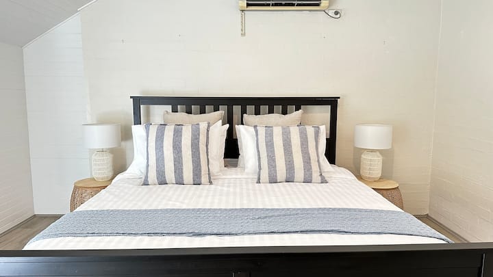 - Dhoma kryesore e gjumit është një oaz i qetë, me një krevat të rehatshëm me madhësi dopio "queen" dhe një dhomë dushi ngjitur për më shumë privatësi.