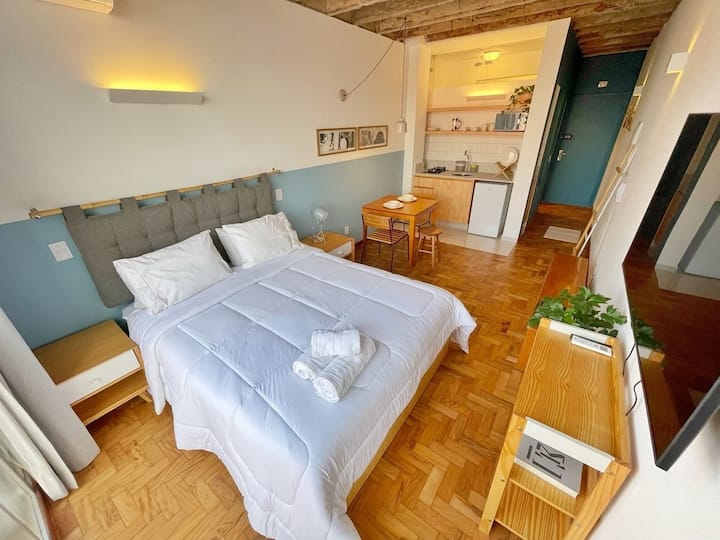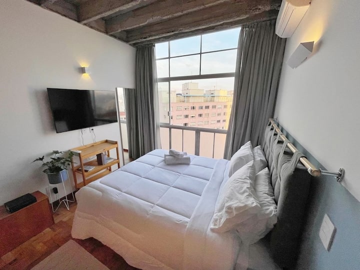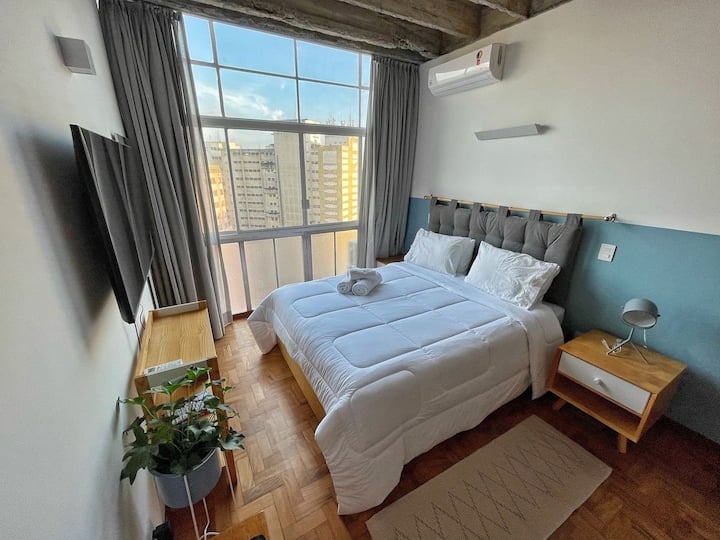Studio e plotë për qëndrimin tënd më të gjatë në Copan. Apartamenti është në katin e 21-të dhe ka një pamje të mrekullueshme të qytetit. Përveç kësaj, ka ajër të kondicionuar në mënyrë që të mos vuash në ditët e nxehta. Me krevat dopio "queen", studioja ka gjithashtu një lavatriçe dhe tharëse dhe internet të shpejtë. Qëndro pranë pamjeve kryesore të São Paulo dhe restoranteve më të mira në Brazil, si Casa do Porco, Cuia dhe Bar da Dona Onça.