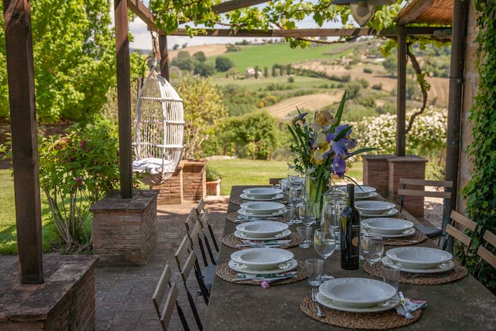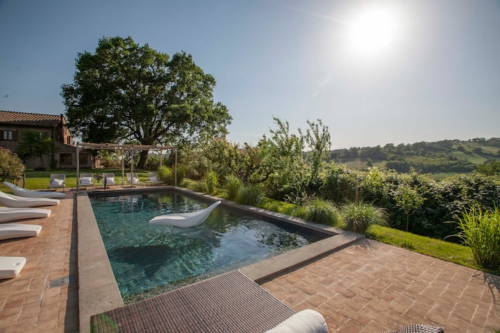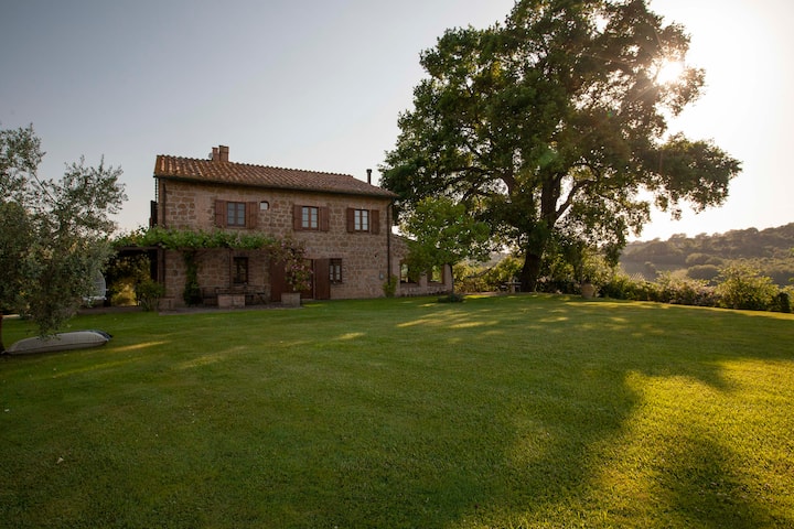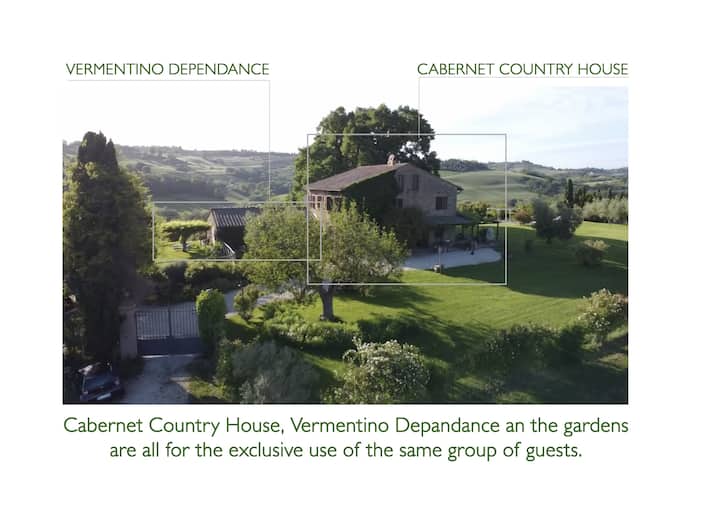 Shtëpia e fshatit ndodhet në fshatrat Umbriane (1 orë nga Roma), me pamje panoramike me pamje nga vreshtat tona. Ka një kopsht 5000 metra katrorë me lëndinë angleze, pishinë me ujë të kripur, pemë ulliri, pemë frutore dhe trëndafila antike. Kantina e verës është 500 mt larg, prandaj, nëse dëshironi, do të thithni atmosferën e një vendi ku është bërë vera. Je i mirëpritur të vizitosh bodrumin për degustim vere dhe për shëtitje në vreshta.