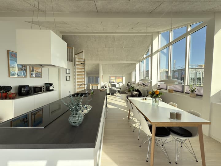 Ballkon i bukur - me pamje nga marina dhe Bindesbøll Fiskepakhusene (magazina peshku).