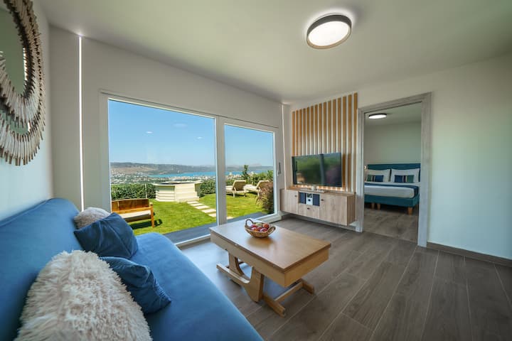 Pamja panoramike e oqeanit nga tarraca e madhe e përparme është absolutisht magjepsëse. Shikimi i lindjes dhe perëndimit të diellit mbi gjirin Chania do të krijojë padyshim momente të paharrueshme. Muri prej xhami në zonën e ndenjjes ofron një lidhje pa probleme me ambientet e jashtme, duke sjellë pamjet mahnitëse të oqeanit në banesën tënde.