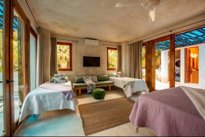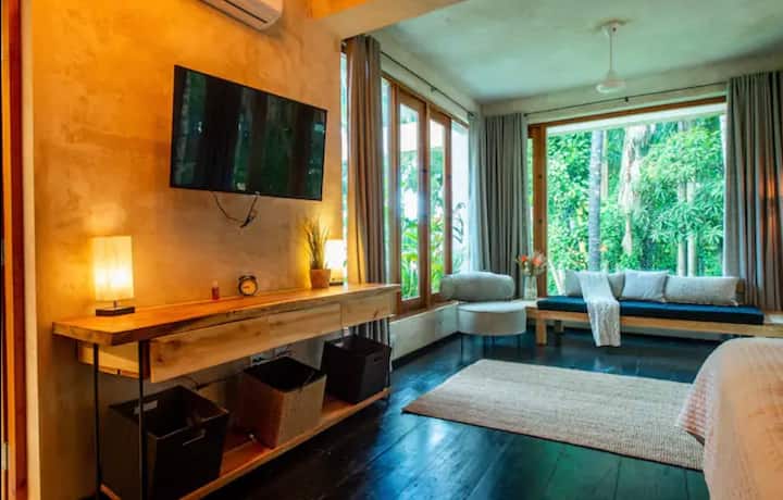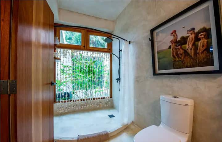 Kjo dhomë gjumi është ngjitur me një tarracë shumë të madhe me një hamak lëkundës për 1 person, tavolinë/karrige të jashtme, salla dielli/ sallone të mëdha dhe shumë bimë për të siguruar mbrojtje dhe hije nga dielli dhe shiu tropikal.