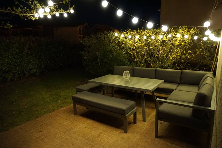 Tarracë me pamje nga kopshti: e vendosur në mënyrë ideale me pamje nga jugu, e pajisur me një mobilie të rehatshme kopshti për 8 persona, një çadër, shezlongë/krevate dielli dhe një plancha.
