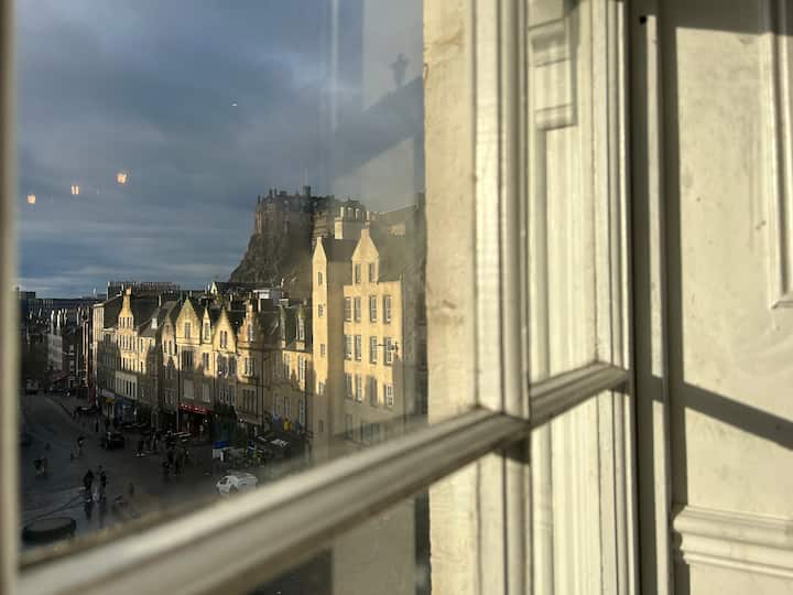 Një dritare elegante gjeorgjiane me pamje nga arkitektura tipike e banimit në Edinburg. Binarët e varur, tavolinat anësore, abazhurët pranë krevatit dhe një kuti e vjetër me sirtarë me pasqyrë plotësojnë një vend të rehatshëm për një kip rimbushës!