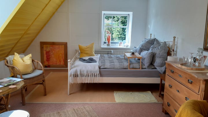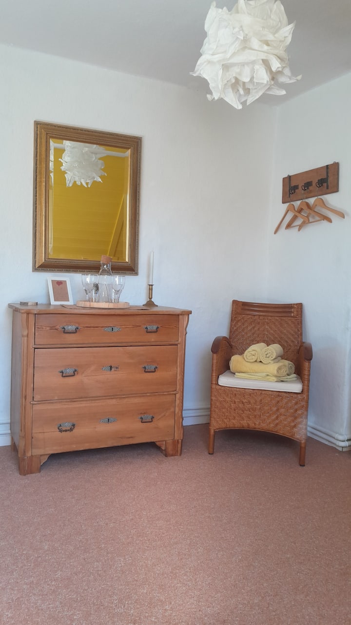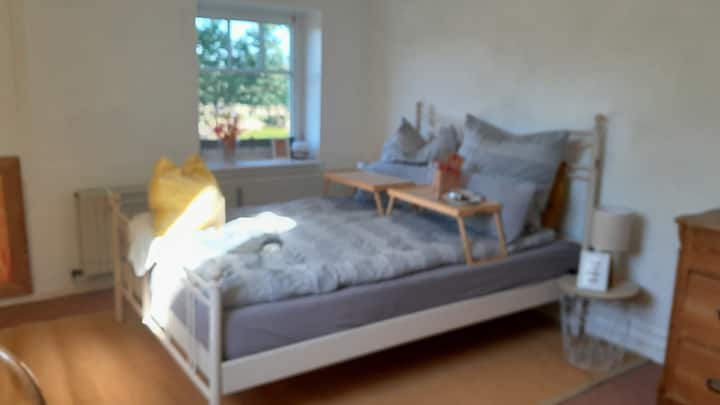 LebensHaus në Lührshoff në Lüneburg Heath të fton të gjesh hapësirën tënde shumë personale, me një total prej 3 dhomash unike dhe të pajisura me cilësi të lartë për vizitorët këtu në Airbnb me pamje fantastike dhe një vendndodhje të shkëlqyer. "Lichtblick" "Weitblick" und "Glücksblick". Ndërtesat e oborrit të Lührshoff mund të shihen nga larg nga veçantia e tyre e ruajtur me dashuri dhe historike. 200 vjet histori ferme, e kombinuar me elemente moderne, art dhe ndërgjegjësim, kjo përzierje e veçantë të pret në shtëpinë e jetës dhe në dhomën e ndenjjes "Lichtblick". Ndodhet në katin e 2-të me pamje fantastike nga jugperëndimi me diell mbi pyjet Auetal dhe heather. Kjo dhomë e ndriçuar dhe e pajisur mirë ka një dritare me drejtim nga jugu dhe një dritë qielli në perëndim, kështu që ke një pamje të gjerë mbi Auetal dhe pyjet dhe fermën fqinje islandeze të kuajve. "Pamja e dritës" përfshin një dhomë gjumi me një krevat dopio të rehatshëm 1,40 m, me pamje nga krevati nga dritarja. Një zonë e vogël ngrënieje dhe një sallë kafeje dhe çaji me thekëse buke. Çdo gjë është e disponueshme për përgatitjen e mëngjesit ose një meze të lehtë në dhomë. Për vaktet e nxehta, restorante të shumta janë në afërsi. Nuk ka kuzhinë në shtëpi. Dhoma e dushit dhe tualeti ndodhen përballë në anën tjetër të korridorit të përbashkët dhe janë të disponueshme vetëm për një dhomë tjetër vizitorësh. Çdo dhomë ka ndarjen e vet të dollapit për enët në banjë dhe raftin dhe raftin e vet të peshqirëve. Në korridor ka një frigorifer të vogël të përbashkët për dy dhoma dhe një stacion për larjen e enëve.