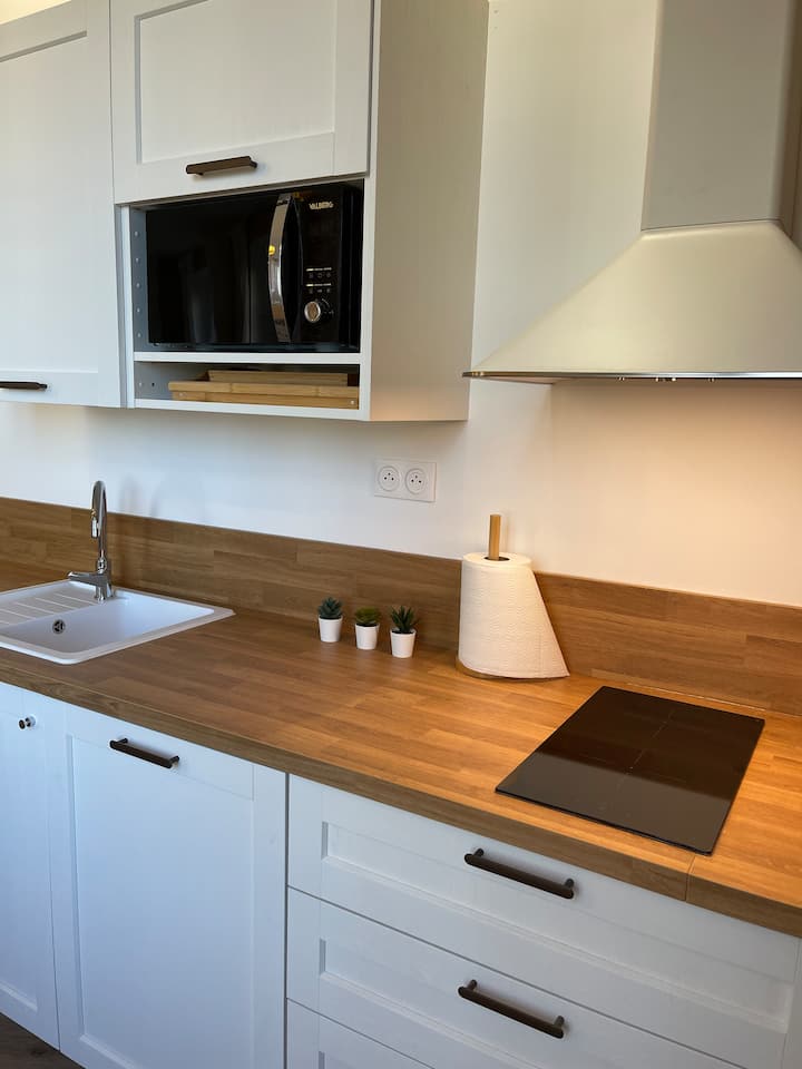 Kuzhinë e pajisur (pianurë me induksion, enëlarëse, furrë/mikrovalë, frigorifer, aparat kafeje, ibrik, thekëse buke dhe enë)