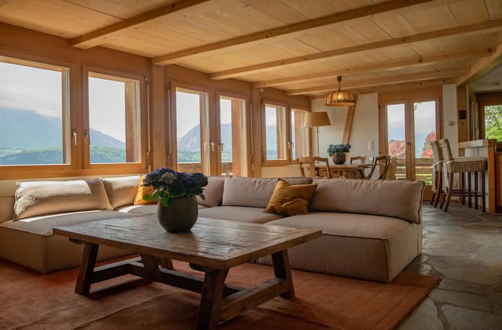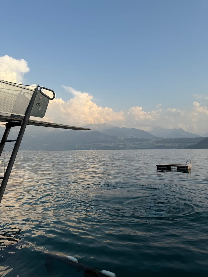 Vetëm një minutë më këmbë nga Liqeni i Thunit ndodhet chaleti ynë i veçuar, i cili nuk është ngjitur me asnjë fqinj dhe ofron shumë qetësi dhe privatësi. Është vendi ideal për pushime në të gjitha stinët.