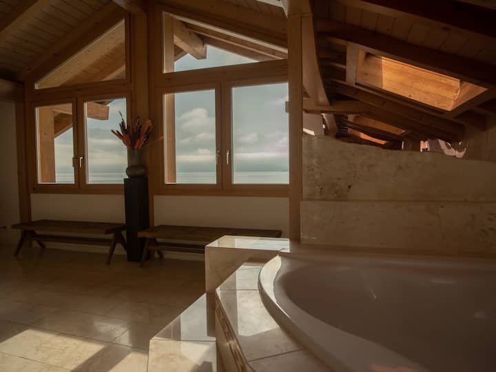 Apartamenti i sipërm ka dy dhoma gjumi të mobiluara me shije dhe ofron pamje të mrekullueshme dhe të drejtpërdrejta të liqenit Thun dhe maleve. Mobiliet janë projektuar me shumë dashuri për detajet, me materiale natyrale, si druri dhe guri, si dhe mobilie elegante për rehati maksimale.