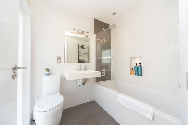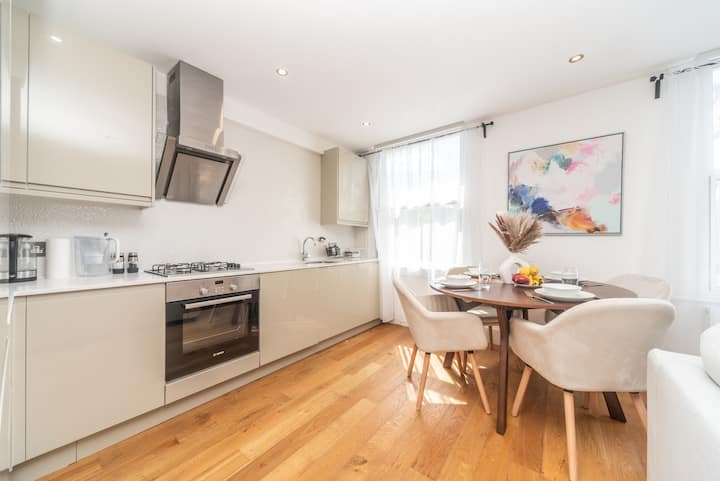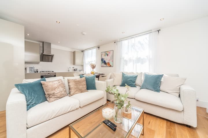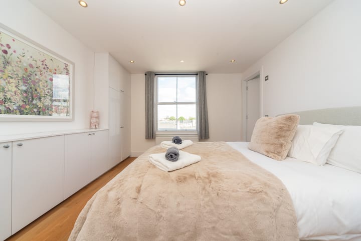 Apartamenti ynë i sapo rinovuar me kate të ndara flenë 6 në dy dhoma gjumi të mëdha dopio brenda në suitë dhe një divan krevat dopio i rehatshëm. Shijo pamjet e horizontit në të gjithë Londrën nga dhoma e gjumit në katin e sipërm. Penthouse.