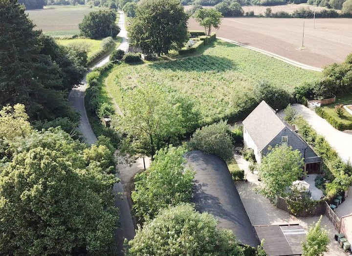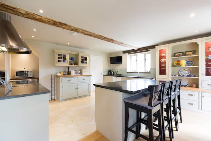Hangar i gjerë i shndërruar në Cotswold. Lojëra/Muzikë Hangar me projektor dhe tavolinë snooker. Oxhak Inglenook, sobë me shumë funksione, 2 zona kopshti me barbekju. Vaskë me hidromasazh (ekstra). Ideale për familje, grupe, festa ose biznes. Për 16+ vizitorë, kërko një çmim të personalizuar. Zbritje për 3+ net. Çmimi përfshin tarifat e Airbnb. Kërko një zbërthim. Mund të merret me qira me shtëpinë fqinje. Shënim: Dhomat e gjumit 3 dhe 4 formojnë 1 banjë të madhe (7 tekë + 1 dopio) përmes shkallëve spirale.