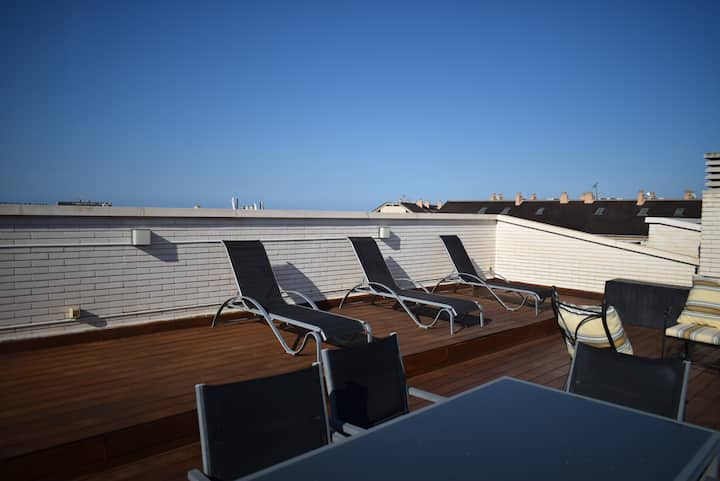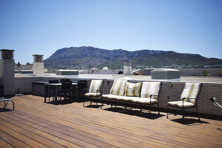 Një veçori e spikatur e kësaj apartamenti nën çati është tarraca e sipërme panoramike prej 60 m² e përdorimit ekskluziv, që ofron pamje 360 gradë të detit, kopshtit, kështjellës Denia dhe Parkut Natyror Montgó. E pajisur me shezlongë dielli, një tavolinë dhe gjashtë karrige, një divan dhe dy kolltuqe, është vendi i përkryer për t 'u çlodhur dhe për të shijuar mjedisin përreth.
