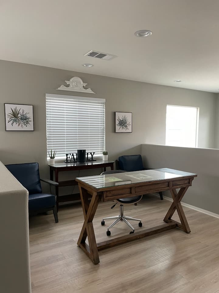 Një hapësirë pune e dedikuar në papafingo me një tavolinë, ideale për punë ose studim në distancë