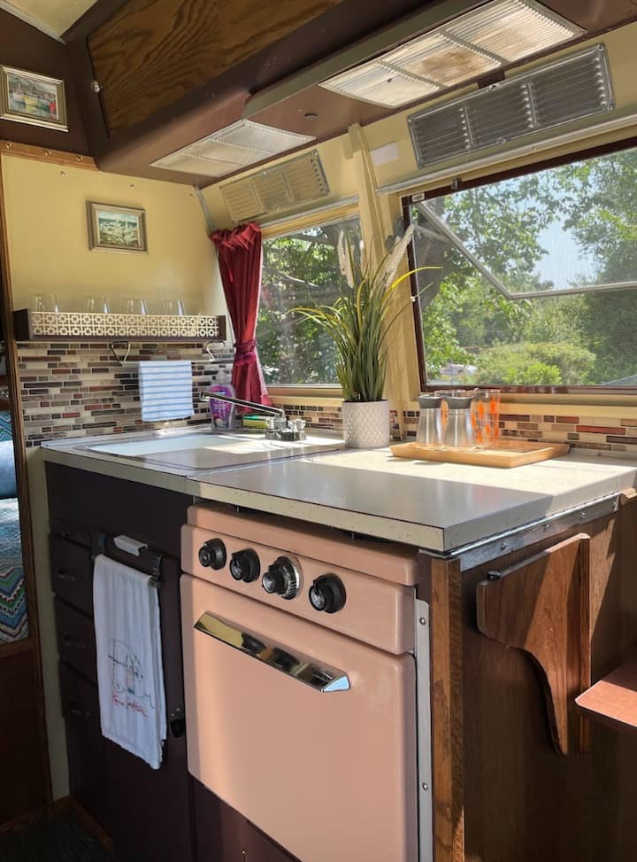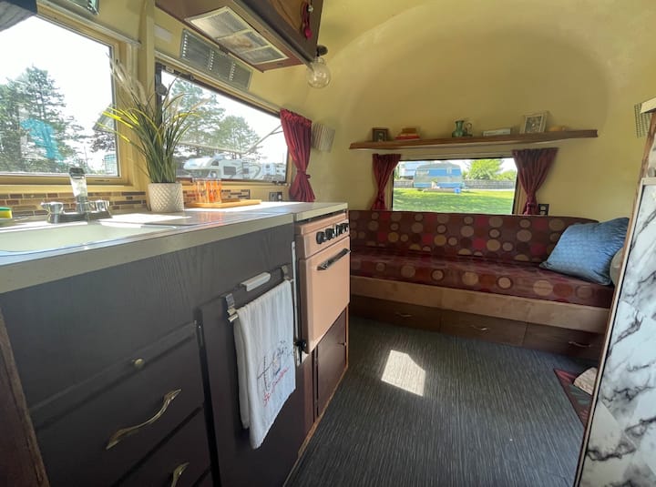 Ndërsa hyn brenda Margaux, do të transportohesh prapa në kohë me dekorin e saj retro, atmosferën e vjetër dhe orenditë klasike. Kamperja ka një hapësirë të rehatshme për t 'u ulur që dyfishohet si një krevat i vogël, një kuzhinë të lezetshme me një mini frigorifer dhe mikrovalë dhe dy krevate dyshe në mes.