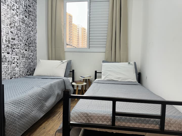 Dhoma e dytë është e përkryer për fëmijë ose vizitorë. Ka dy krevate tek, tashmë të përgatitur me shtroja të freskëta dhe të pastra. Dollapi i integruar të lejon të organizosh në mënyrë të rehatshme rrobat dhe sendet personale.