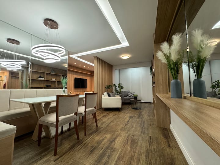 Dhoma e ndenjjes, zemra e apartamentit, është një hapësirë moderne me dizajn, e karakterizuar nga linja të pastra dhe përfundime elegante. Ndriçimi është një element qendror i këtij mjedisi: tavani është i dekoruar me kaseta LED që krijojnë një dritë të butë dhe relaksuese, të përsosur për çdo rast. Në qendër të tavanit, ka një llambadar LED me dizajn bashkëkohor që ndriçon tavolinën qendrore dhe pasuron mjedisin me një prekje të sofistikimit. Muret janë pjesërisht të mbuluara nga pasqyra që zmadhojnë hapësirën dhe pasqyrojnë dritën, duke ofruar një ndjesi amplitudë dhe shkëlqim më të madh.