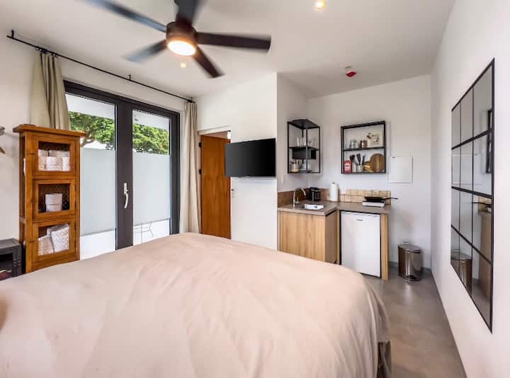 Krevat dopio "KING" në dhomë private vizitorësh me verandë