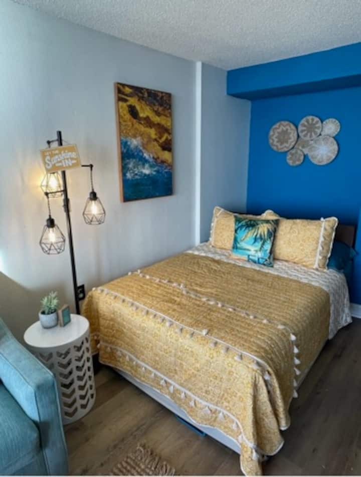 Kuzhina është e pajisur plotësisht me një bar kafeje dhe të gjitha pajisjet, enët, gotat, enët, tenxheret dhe tiganët e nevojshëm për të përgatitur një vakt të shijshëm. Pak përtej kuzhinës, dhoma e ndenjjes/zona e studios ofron një hapësirë të rehatshme me një krevat Murphy me një dyshek krejtësisht të ri. Ky krevat i gjithanshëm ofron një zonë të veçantë gjumi, duke i lejuar vizitorët të pushojnë ndërsa shijojnë pamjet e mrekullueshme të oqeanit.