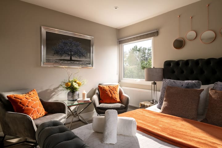 Përtej zonës së sallës, ka një divan të rehatshëm në formë L-je përballë dritares së madhe me pamje nga kopshti dhe fshatrat përreth. Ka gjithashtu një karrige të gjatë për t 'u çlodhur. Pra, ka shumë hapësirë për të gjithë për t 'u ulur dhe për të parë një film në Smart TV kur është koha për t' u çlodhur dhe për t 'u çlodhur për pak kohë.