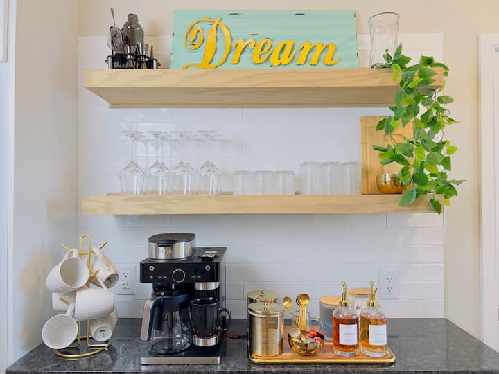 • Kuzhina është e pajisur plotësisht me të gjitha pajisjet, duke përfshirë një enëlarëse për pastrim të lehtë dhe ka një bar kafeje të dedikuar për të filluar mëngjeset e tua me stil. D.M.TH. tigan me ajër, blender, thekëse buke, tenxhere dhe tiganë, tenxhere çaji.