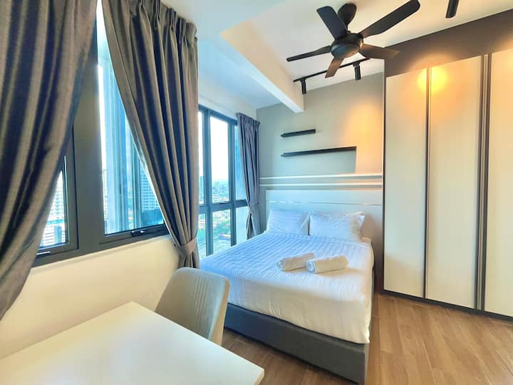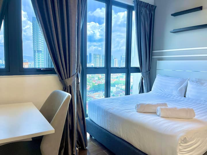 Studio e gjerë në katin e sipërm me pamje nga KLCC dhe pamjen më të MIRË të Sky Pool - KLCC Twin Tower, KL Tower, Merdeka 118 Tower. Vetëm 5-10 minuta në këmbë nga të gjitha atraksionet kryesore të qytetit dhe qendrat tregtare.