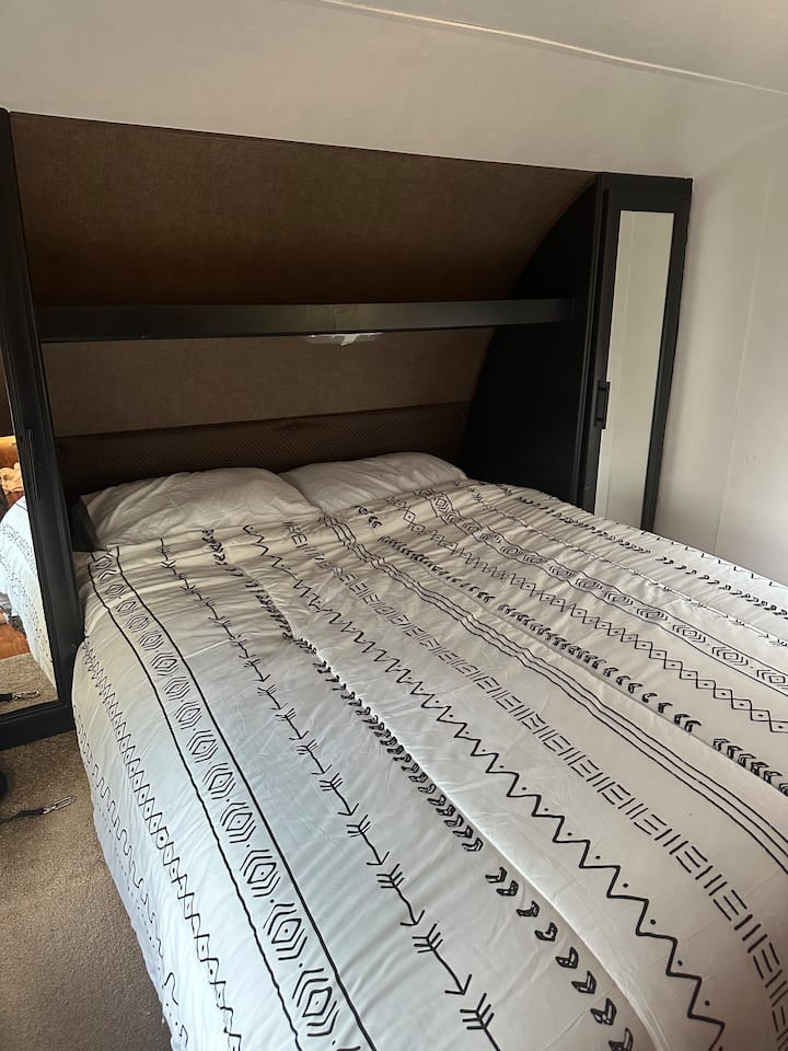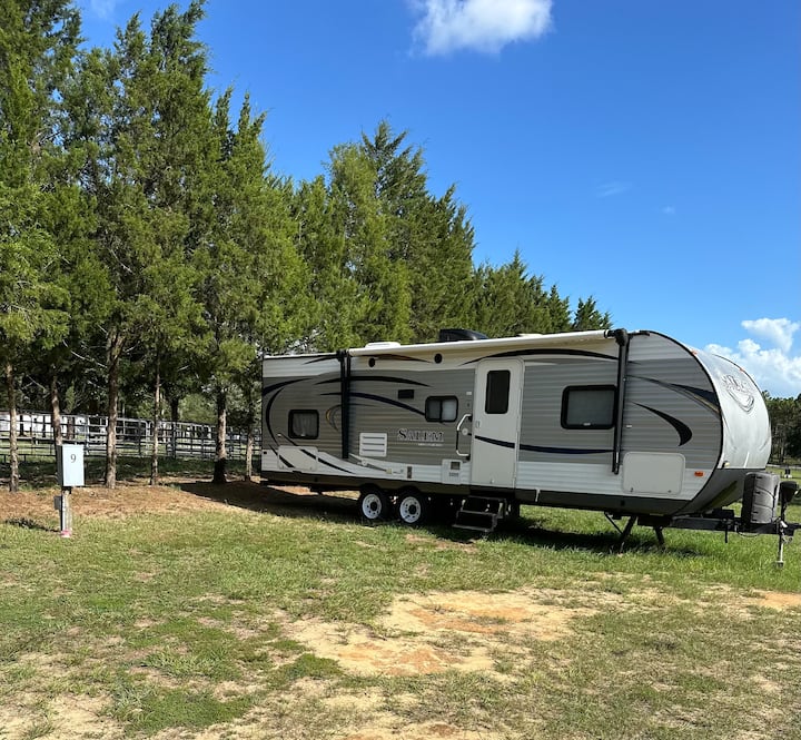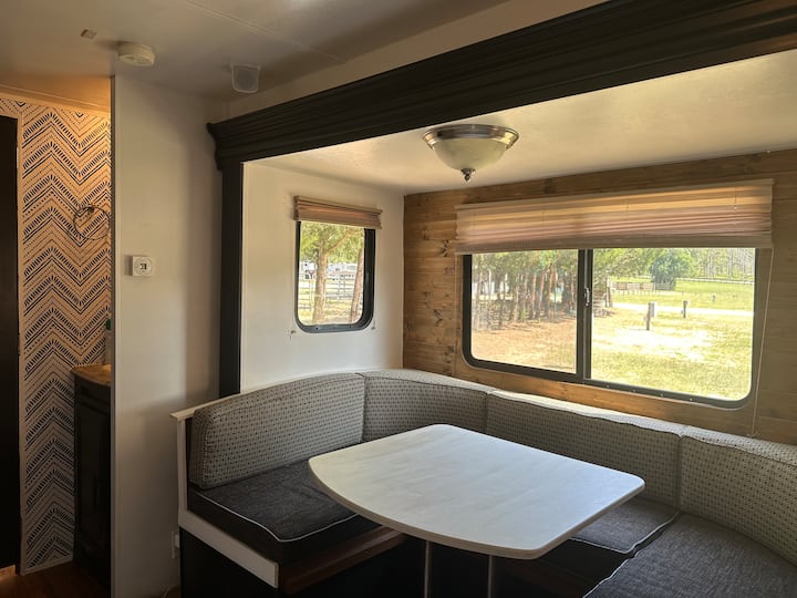 Qëndrim i qetë me rulotë në një fermë kuajsh
