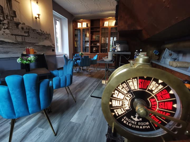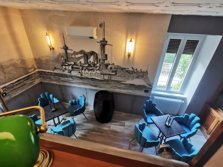 Një mjedis me stil industrial, i frymëzuar nga bota e anijeve të vjetra me avull. Mbulesat metalike, detajet e punuara me dorë dhe ndriçimi i ambientit krijojnë një përvojë piktoreske dhe mikpritëse.