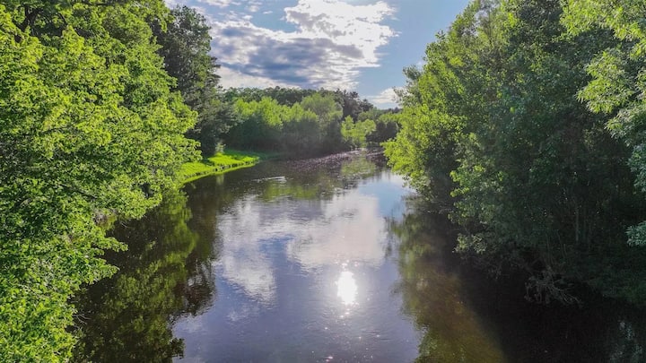 Hyr në nostalgji të rehatshme në pushimin tonë buzë lumit! Kjo shtëpi 4BR/3BA fle 10 me një dyshek me ajër, me dekor të viteve '90, komoditete moderne (televizor i madh 86” LED, televizor me kornizë 65” mbi oxhak, wifi të shpejtë flakërues) dhe hyrje private në lumin Kristal me bankën e të akuzuarve. Brenda hapave të Mullirit të Kuq historik.