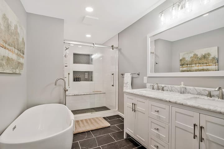 Kjo është një pronë me 3 kate (kati i parë, kati i dytë, bodrumi) dhe vizitorët kanë qasje në të gjithë banesën dhe të rrethuar me gardh në oborrin e pasmë. Vizitorët do të shijojnë 4 dhoma gjumi dhe 3.5 banja. Ka tre dhoma gjumi në katin e dytë. Kryesorja përfshin një krevat dopio "king" me një televizor inteligjent dhe banjë ngjitur. Banja ngjitur përfshin një vaskë të madhe më vete, e përkryer për t 'u çlodhur gjatë qëndrimit tënd. Dhomat e gjumit jo primare në katin e dytë kanë një krevat dopio "queen" me një kuti me sirtarë, të përsosura për vizitorët që qëndrojnë tek ne për më shumë se disa ditë. Dhomat e gjumit jo të zakonshme të katit të dytë ndajnë një banjë jashtë korridorit. Ka gjithashtu një dhomë lavanderie që përmban një lavatriçe dhe tharëse me madhësi të plotë në katin e 2-të.