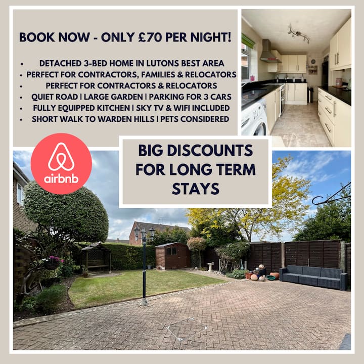 E disponueshme vetëm për prenotime afatmesme dhe afatgjata (minimumi 1 muaj, deri në 6 muaj), kjo shtëpi e shkëputur me tre dhoma gjumi e vendosur mirë ofron një vlerë të pakrahasueshme me vetëm 70 £ për natë — një mundësi e rrallë në një nga zonat më të dëshirueshme dhe më të qeta të banimit në Luton.