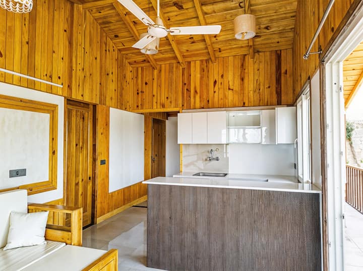Ambienti i ndenjjes me hapësirë të hapur ka një divan-krevat që mund të akomodojë një vizitor shtesë, së bashku me një kuzhinë kompakte të pajisur për nevojat bazë të gatimit.