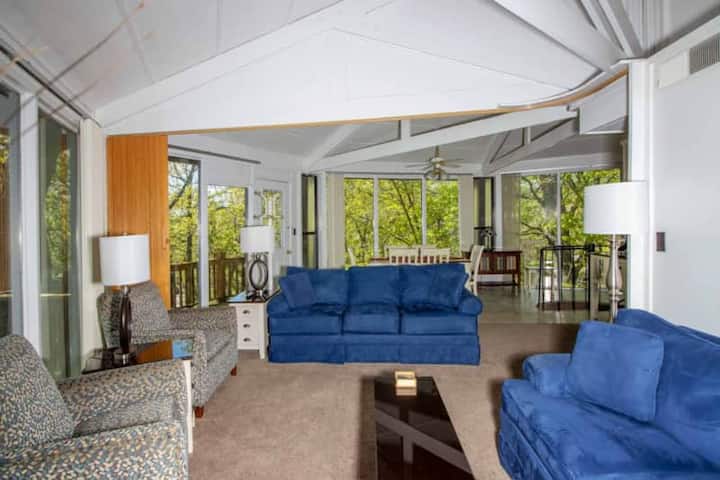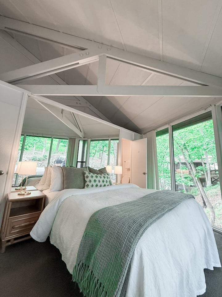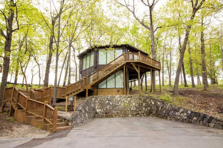 Treetop Nest ofron një planimetri të rehatshme por të gjerë të përsosur për familjet, çiftet ose grupet e vogla. Kjo vilë private me 2 dhoma gjumi dhe 3 banja ka dy dhoma gjumi dopio "queen", një me një banjë en suite dhe një me banjë të plotë në katin e poshtëm, plus një divan gjumi në dhomën e ndenjjes dhe mundësinë për të shtuar një dyshek me ajër për vizitorë shtesë. Do të shijosh një kuzhinë dhe ambient ngrënieje të pajisur plotësisht, të përsosur për vakte të gatuara në shtëpi ose kafe në mëngjes nga kafeneja e përfshirë. Dhoma e ndenjjes është e pajisur me një televizor inteligjent për transmetimin e shfaqjeve të tua të preferuara dhe e gjithë hapësira është projektuar me kujdes për të përzier rehatinë moderne me sharmin rustik. Me artikuj luksozë tualeti, shtroja të buta dhe detaje të stilit resort, The White Oak Retreat është baza e përsosur e shtëpisë për aventurën tënde në liqenin Ozarks.
