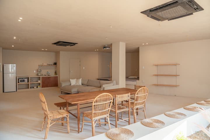 Me të gjithë dritaren e zëvendësuar nga një dritare e madhe e palosshme, kopshti i brendshëm të duket sikur je jashtë kur e hap gjerësisht kur moti është i këndshëm. Kjo e bën më të lehtë ndikimin nga moti. Megjithatë, dy kondicionerët tanë 40-pyeong do të të ndihmojnë gjithashtu të ruash temperaturën e dëshiruar edhe kur është pak e nxehtë ose e ftohtë. Është projektuar për të të ndihmuar të shijosh kopshtin në të gjithë ambientin e brendshëm të ngrënies dhe dhomën e ndenjjes dhe është një atmosferë e shkëlqyer për të bërë fotografi ose për të pirë një filxhan kafe.