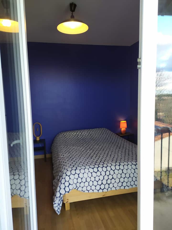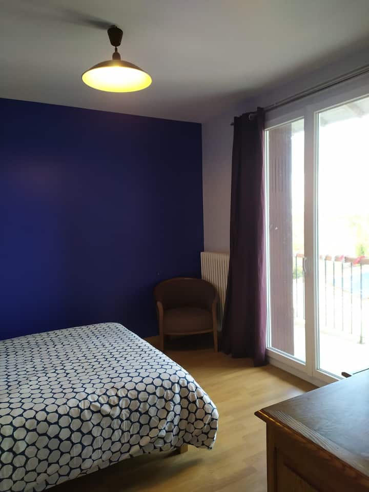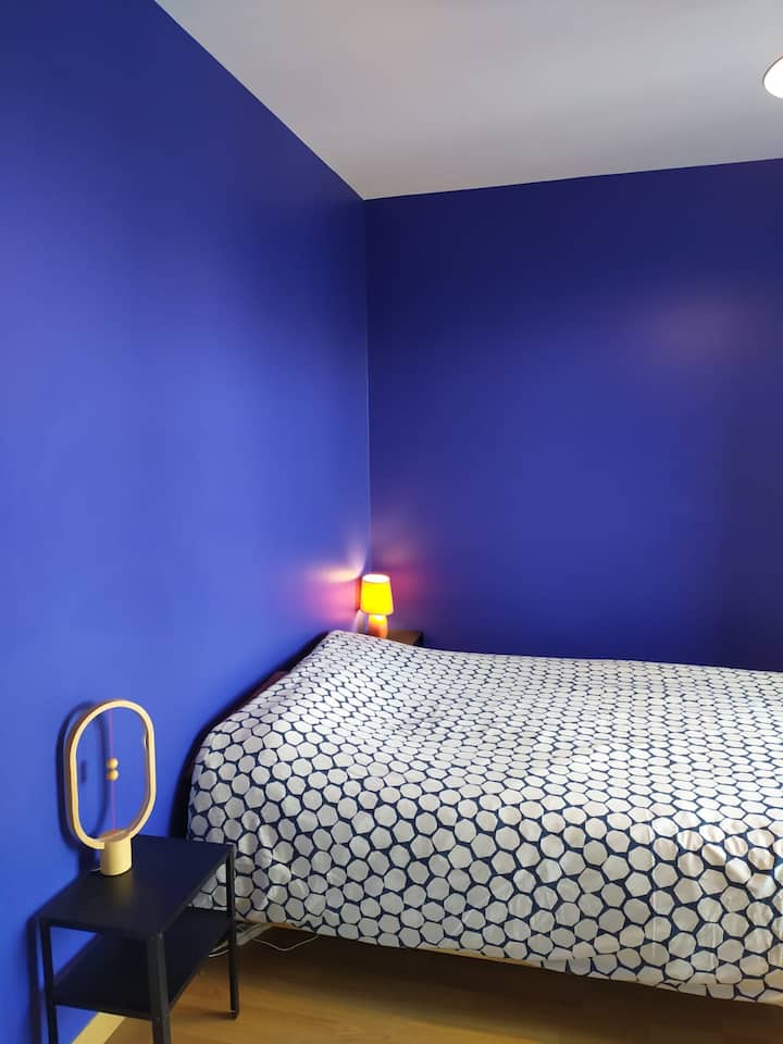 Dhomë gjumi e rehatshme blu në shtëpinë tonë familjare.