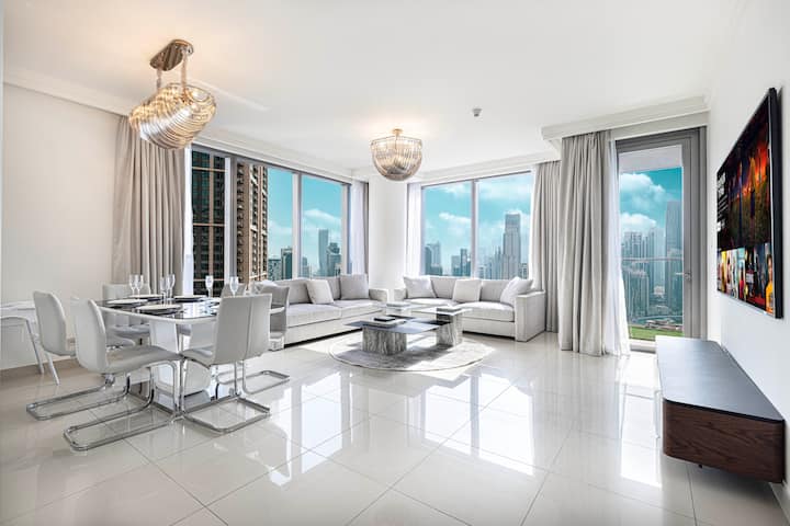 I vendosur në zemër të qendrës së Dubait, ky apartament është i lidhur drejtpërdrejt me Dubai Mall dhe vetëm një shëtitje të shkurtër nga Burj Khalifa. Dritaret nga dyshemeja në tavan ofrojnë një pamje mahnitëse të horizontit të qytetit, duke plotësuar në mënyrë të përkryer dizajnin e lëmuar dhe modern. Pavarësisht nëse je këtu për të eksploruar apo për t 'u çlodhur, kjo arratisje e qetë të vendos disa hapa larg ngrënies, blerjeve dhe metrosë së Dubait të klasit botëror. Adhuruesit e artit do ta vlerësojnë gjithashtu televizorin e madh Samsung Frame, duke përzier argëtimin me elegancën.