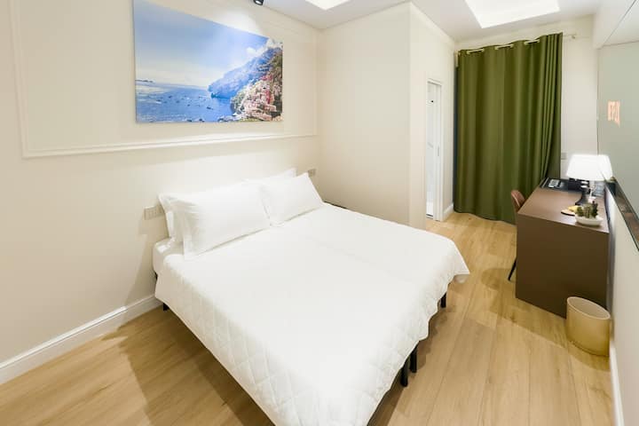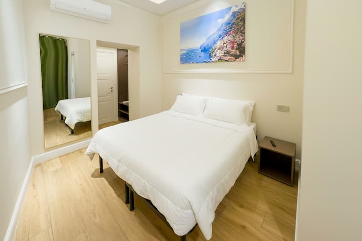 Krevat me çarçafë të butë pambuku garanton një pushim të përsosur, ndërsa printimi panoramik i madh i Bregut të Amalfit i jep dhomës një karakter të rafinuar dhe relaksues.